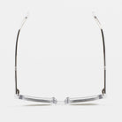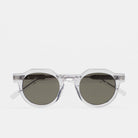 Gafa de sol de forma pantos con ceja plana y puente en llave. Frontal y varillas de acetato transparente. Lente mineral verde base 2 con 100% protección UV y tratamiento antirreflejante. Lente Categoría 3. Plaquetas de acetato incorporadas. Hecha a mano.