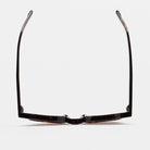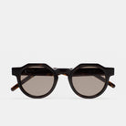 Gafa de sol de forma pantos con ceja plana y puente en llave. Frontal y varillas de acetato havana marrón oscuro. Lente gris degradada base 2 con 100% protección UV y tratamiento antirreflejante. Lente Categoría 3. Plaquetas de acetato incorporadas. Hecha a mano.