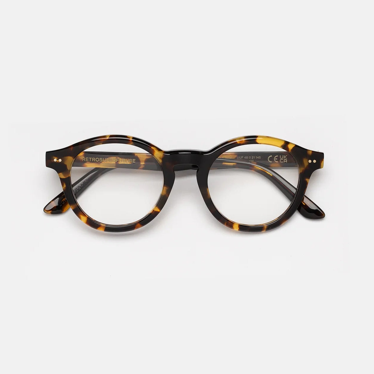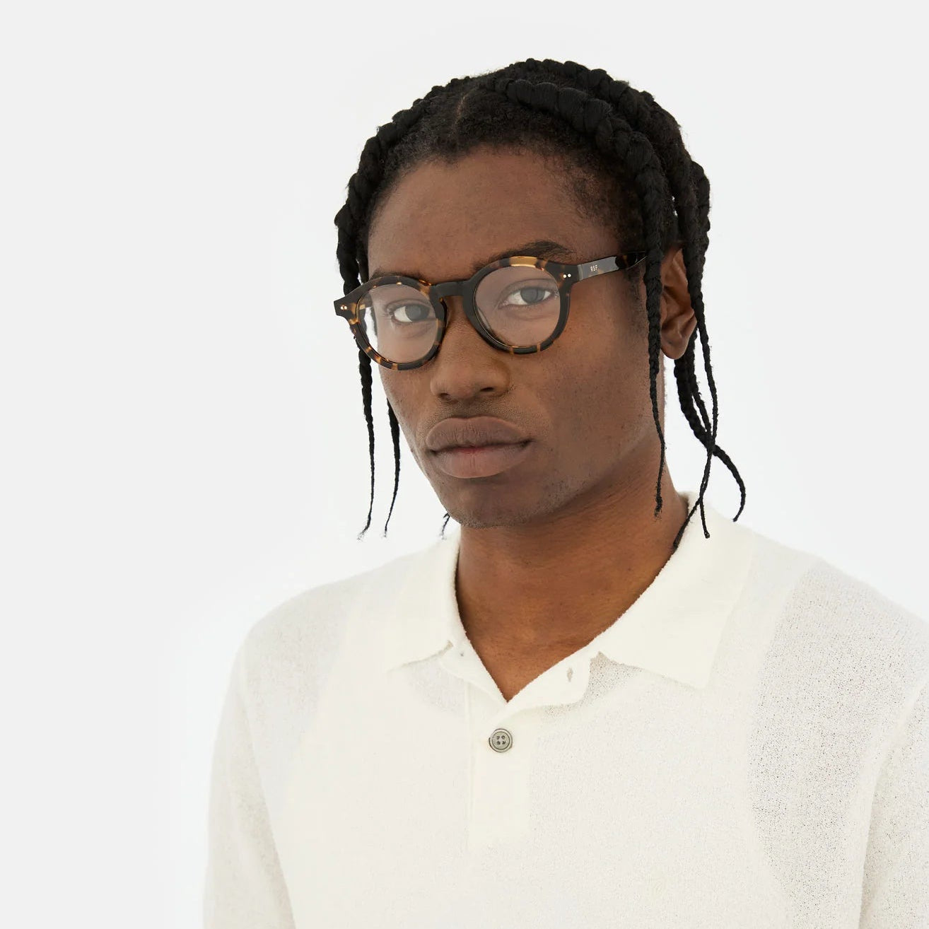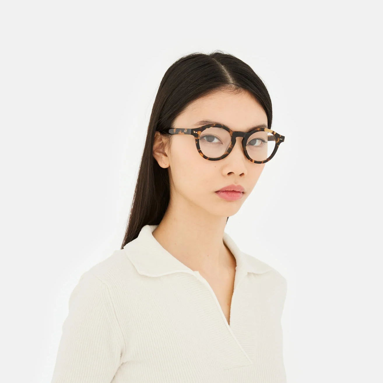 Acetato italiano de alta calidad en un intenso color habano. Lentes transparentes de base 4. Lentes graduadas no incluidas. Gafas de alta gama diseñadas en Milán, Italia.