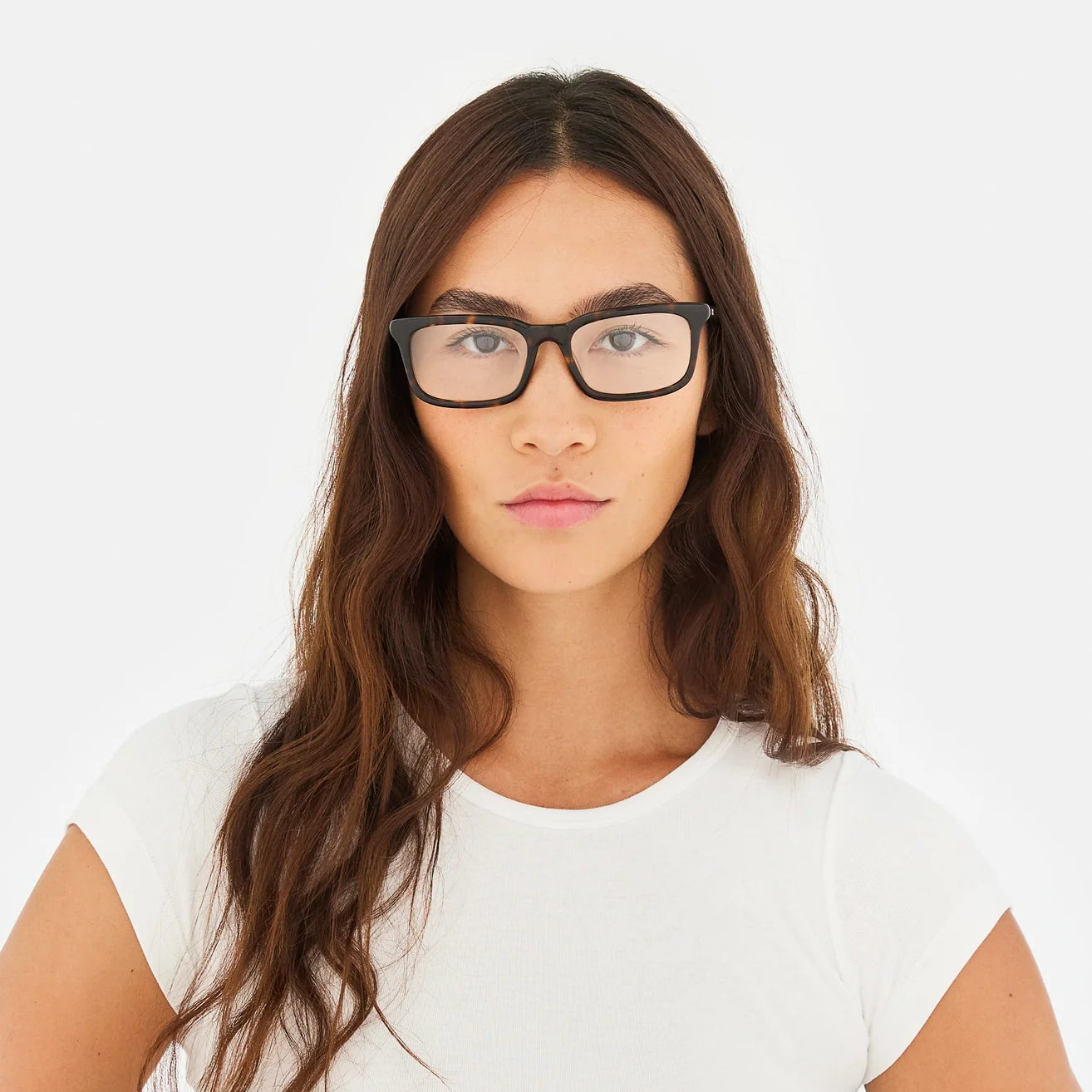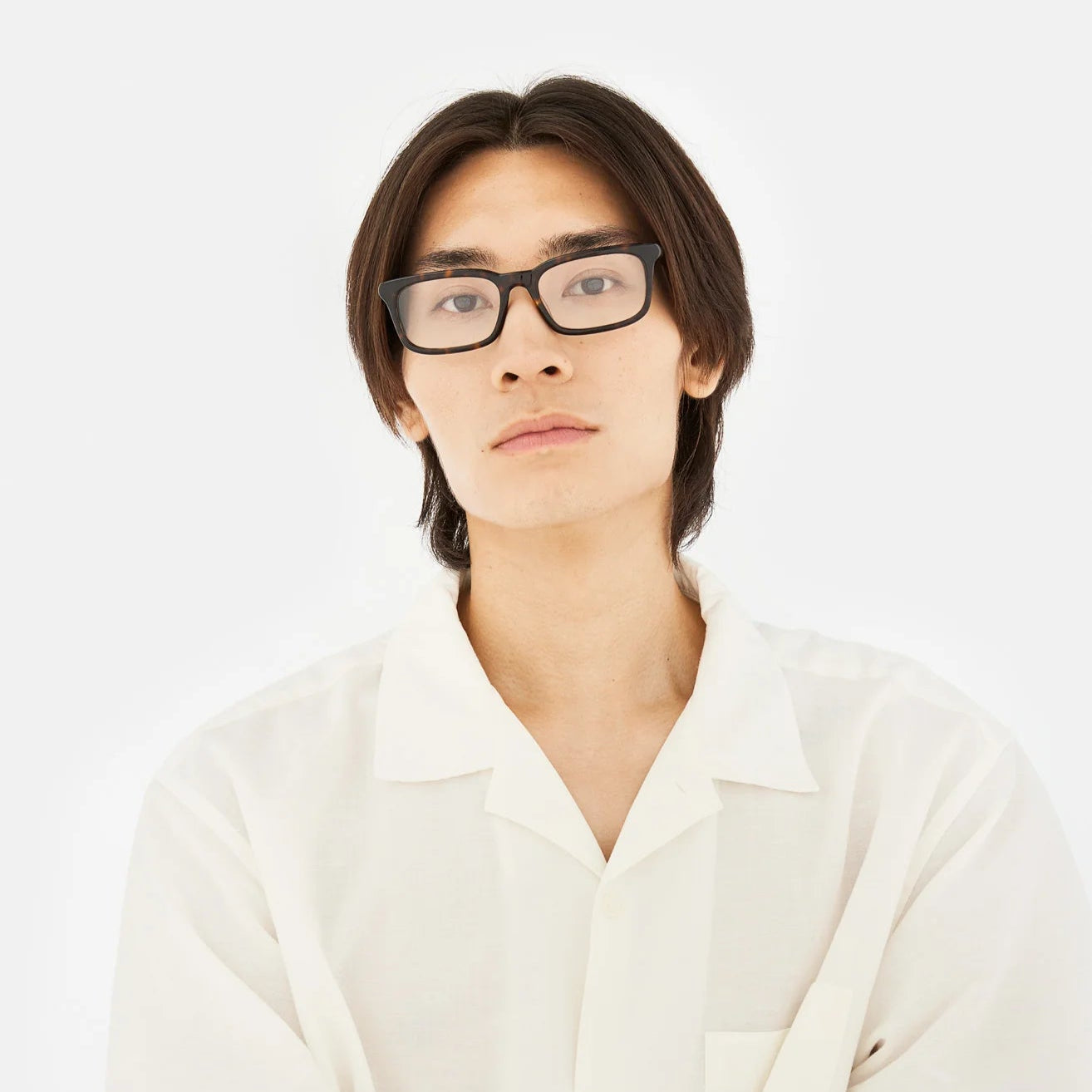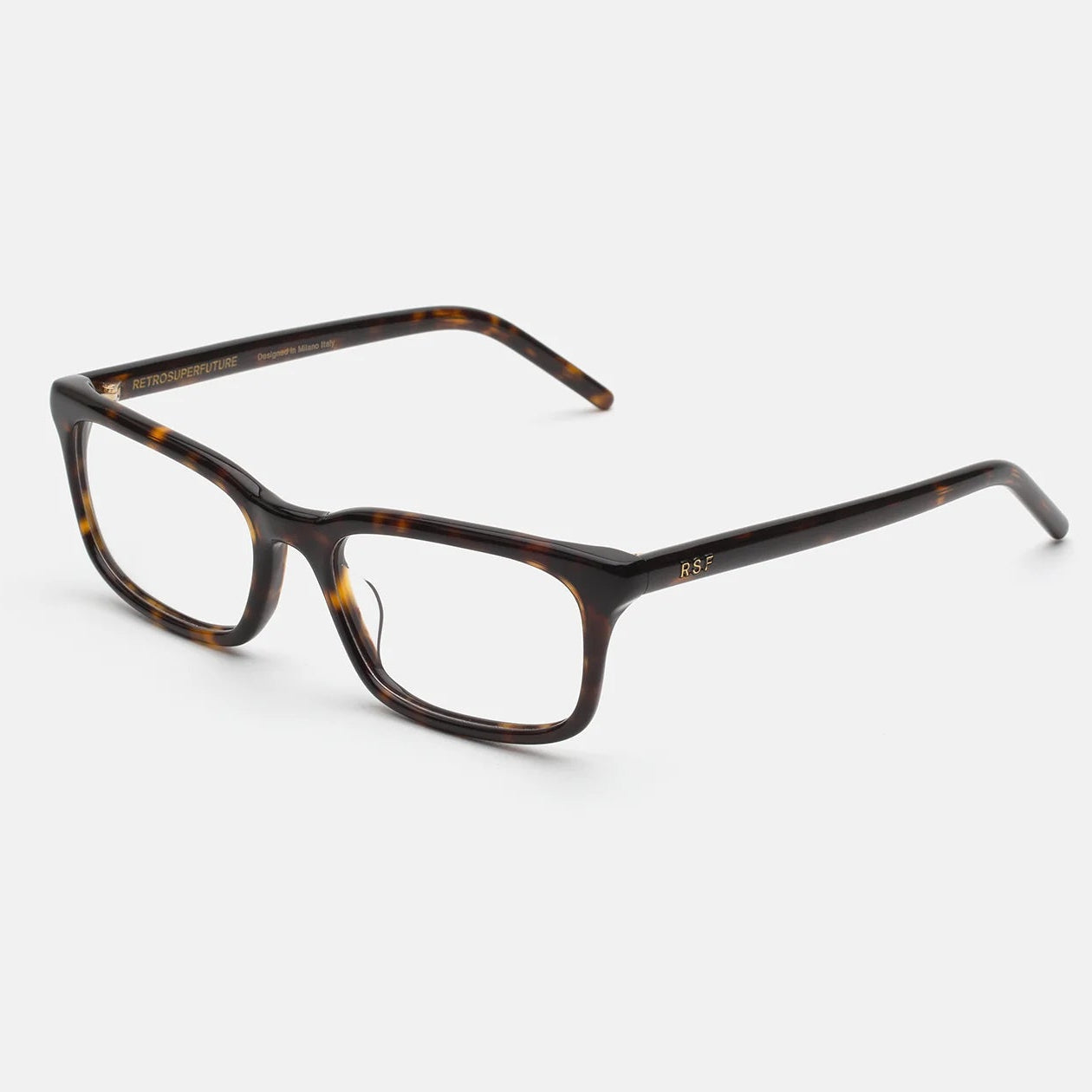 Acetato italiano de alta calidad en un intenso acetato Havana oscuro. Lentes transparentes de base 4. Lentes graduadas no incluidas. Gafas de alta gama diseñadas en Milán, Italia.
