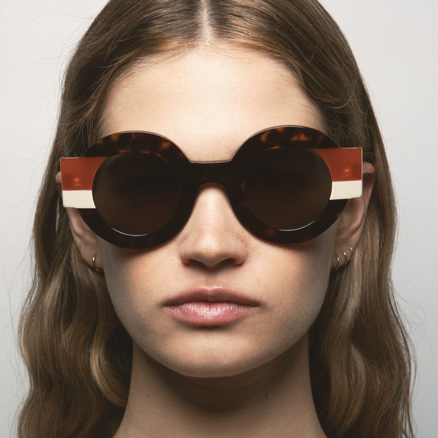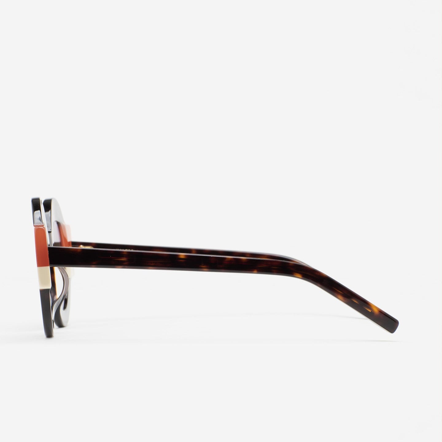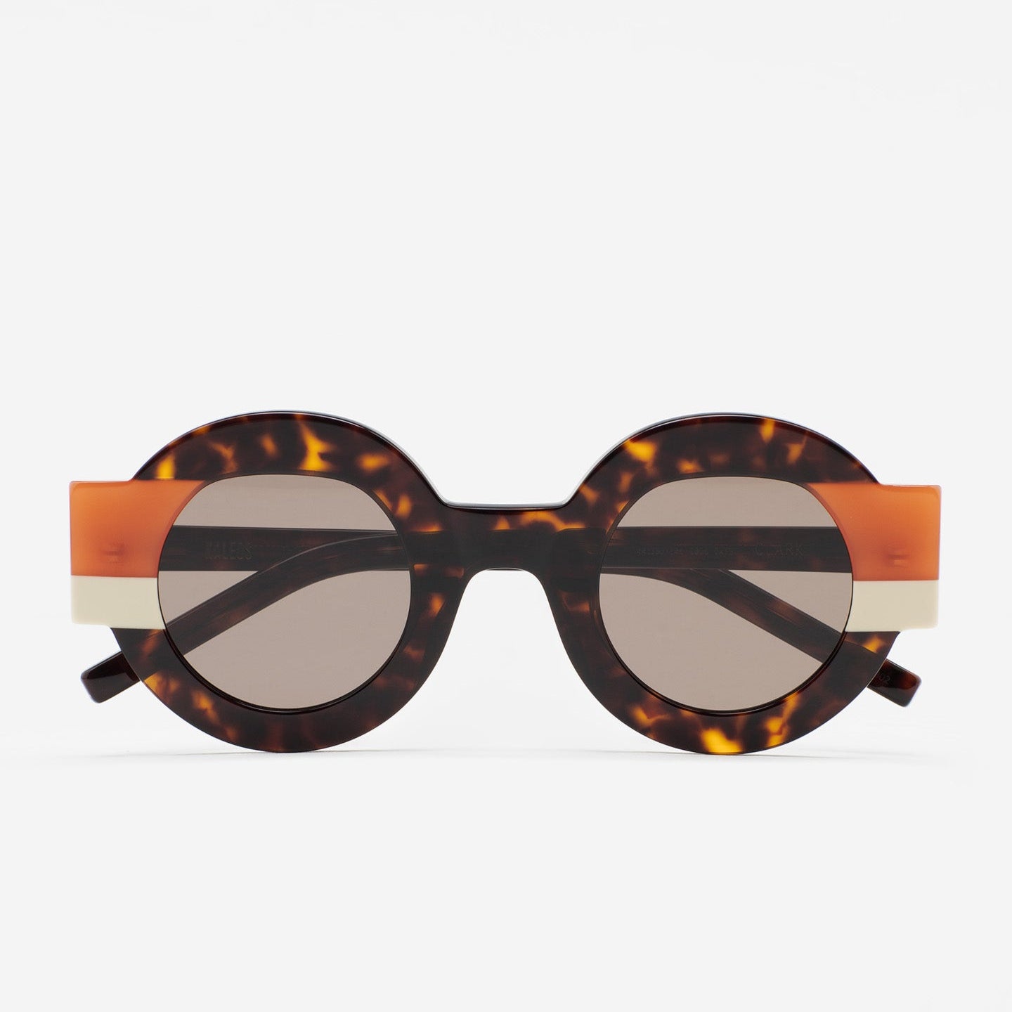 Gafa de sol de forma redonda. Frontal de acetato havana marrón oscuro con doble laminado naranja translucido y beige. Varillas de acetato havana marrón oscuro. Lente gris base 2 con 100% protección UV y tratamiento antirreflejante. Lente Categoría 3. Plaquetas de acetato incorporadas. Hecha a mano.