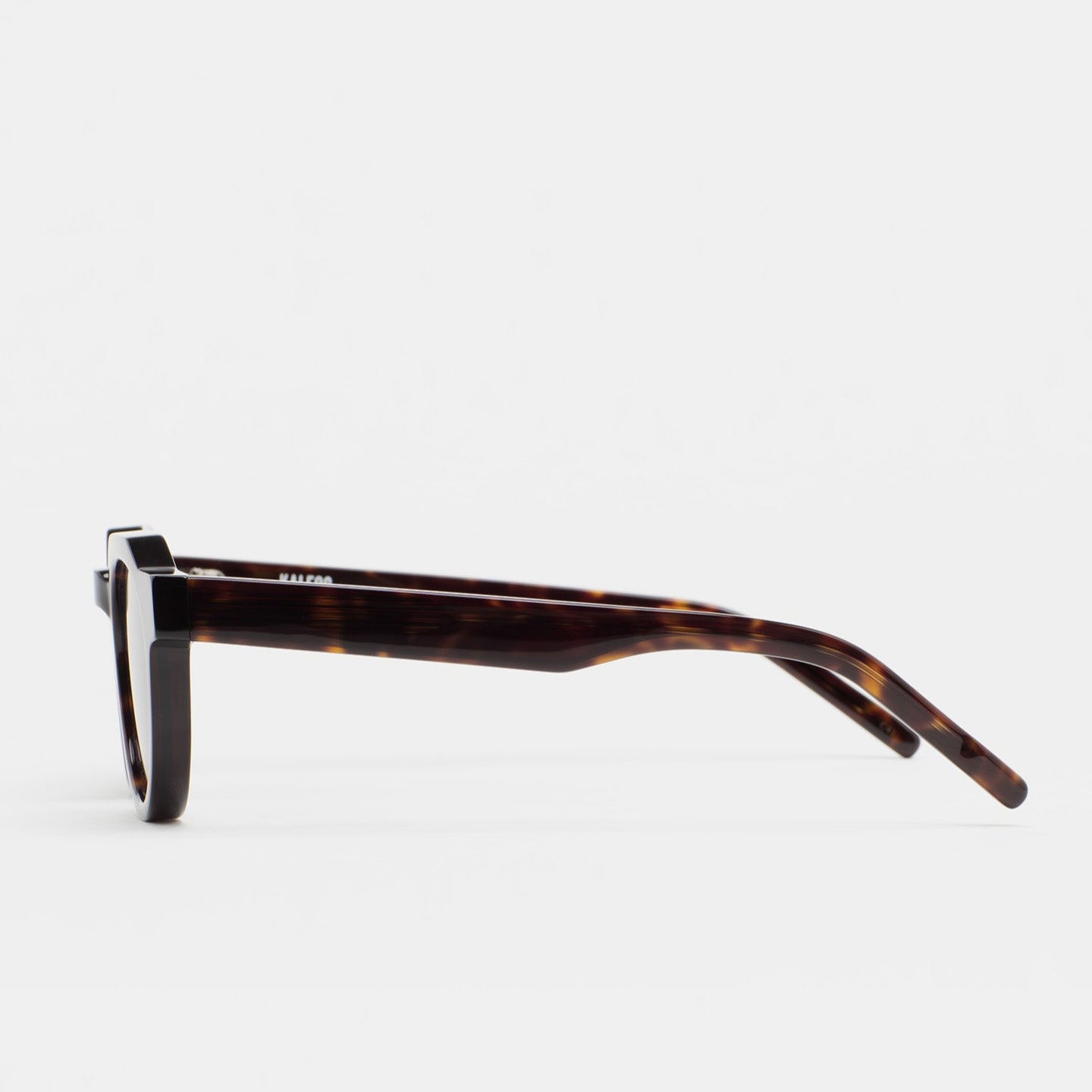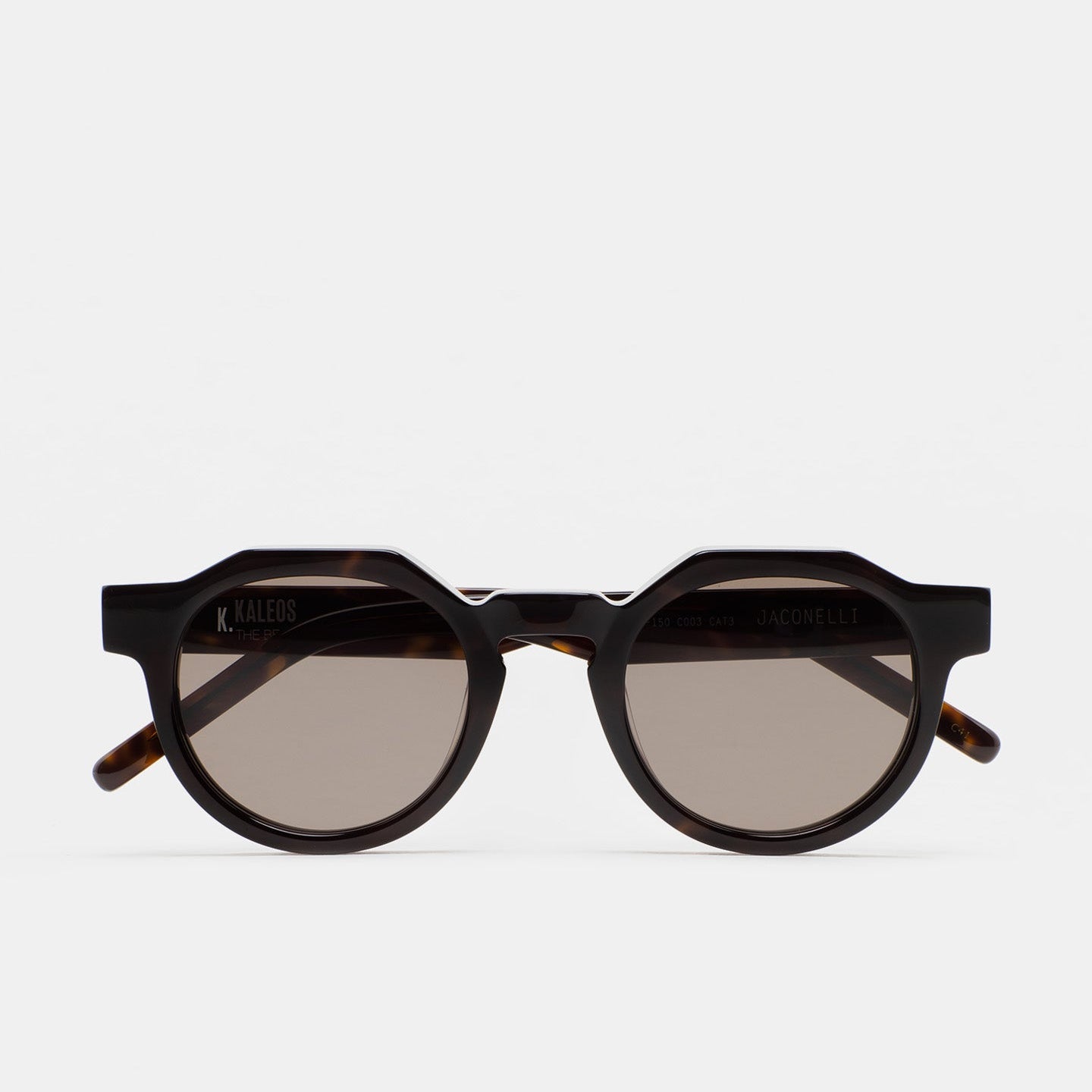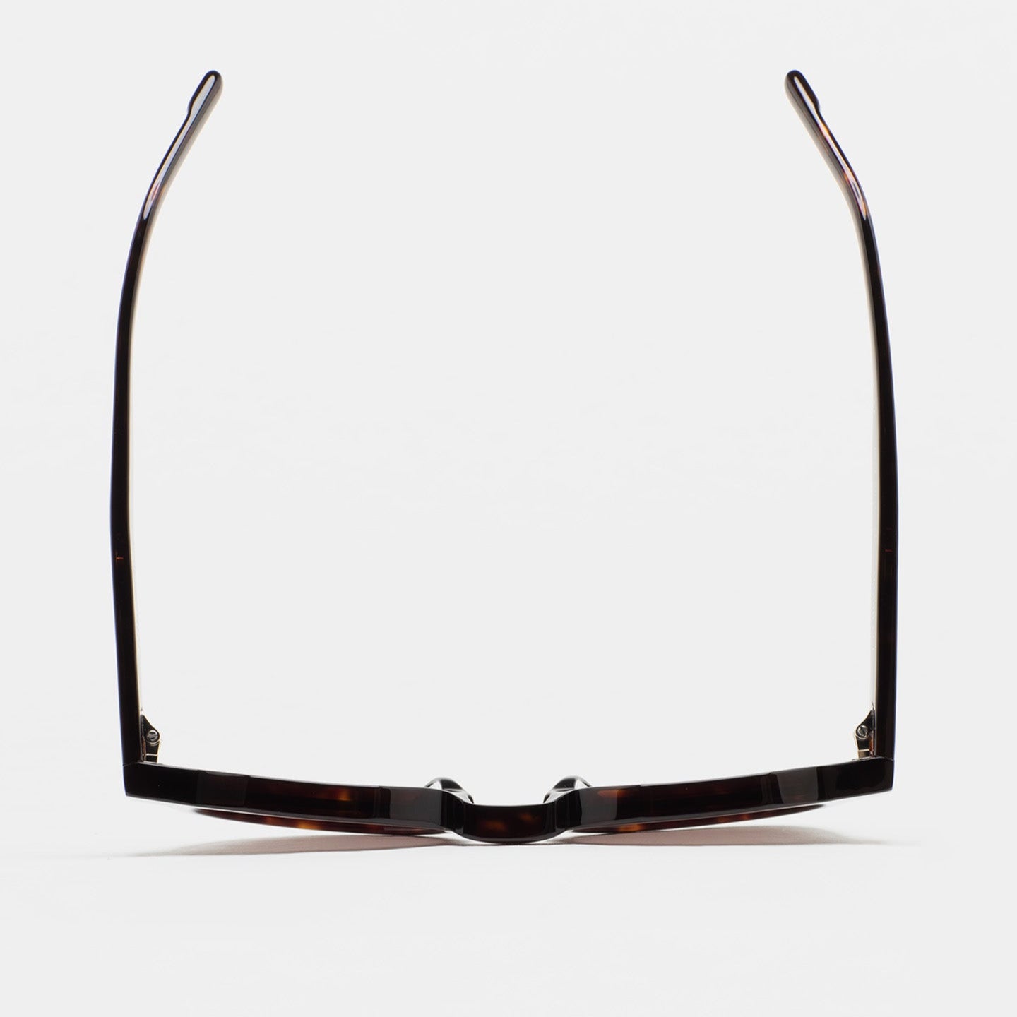 Gafa de sol de forma pantos con ceja plana y puente en llave. Frontal y varillas de acetato havana marrón oscuro. Lente gris degradada base 2 con 100% protección UV y tratamiento antirreflejante. Lente Categoría 3. Plaquetas de acetato incorporadas. Hecha a mano.