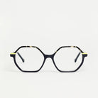 Un clásico con un toque diferente. Las lentes y monturas extragrandes contrastan con las patillas finas y estilizadas.