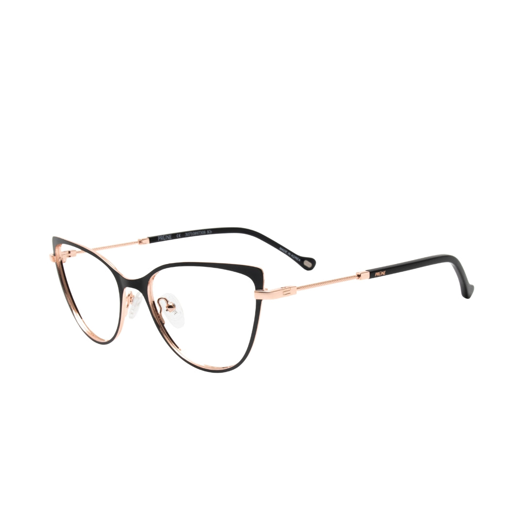 Un diseño que equilibra carácter y sofisticación. Este modelo combina un frente en negro profundo con delicados detalles en tono oro rosa, creando un contraste moderno y femenino. Su silueta levemente cat-eye estiliza la mirada, mientras las varillas metálicas aportan ligereza y un acabado refinado.