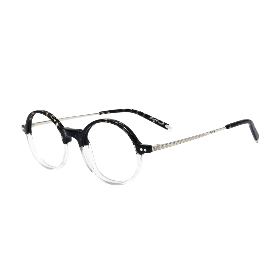 Un diseño que fusiona lo clásico con un giro contemporáneo. Este modelo de silueta redonda combina un degradado en negro y cristal transparente, logrando un efecto visual ligero pero con carácter. El contraste entre el frente robusto y las varillas metálicas finamente trabajadas aporta equilibrio, sofisticación y un aire intelectual moderno.